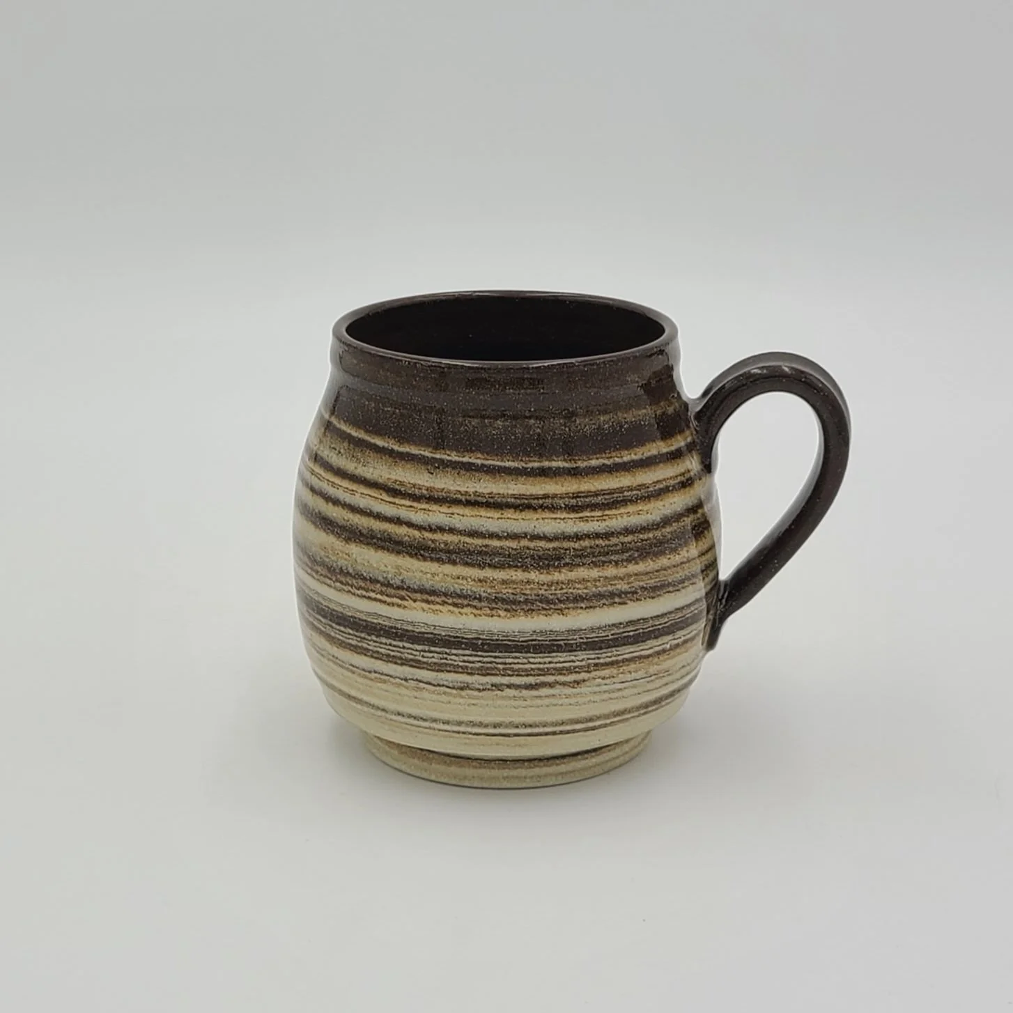 Classic Plump Boi shaped mug made with chocolate brown, tan and white clay.